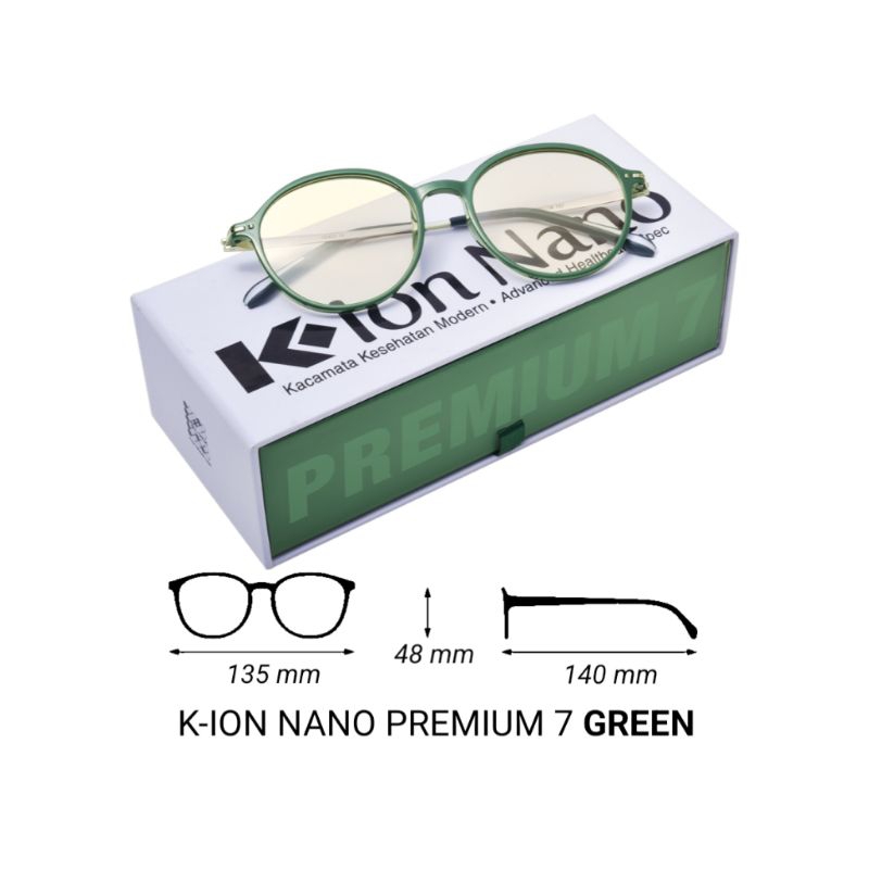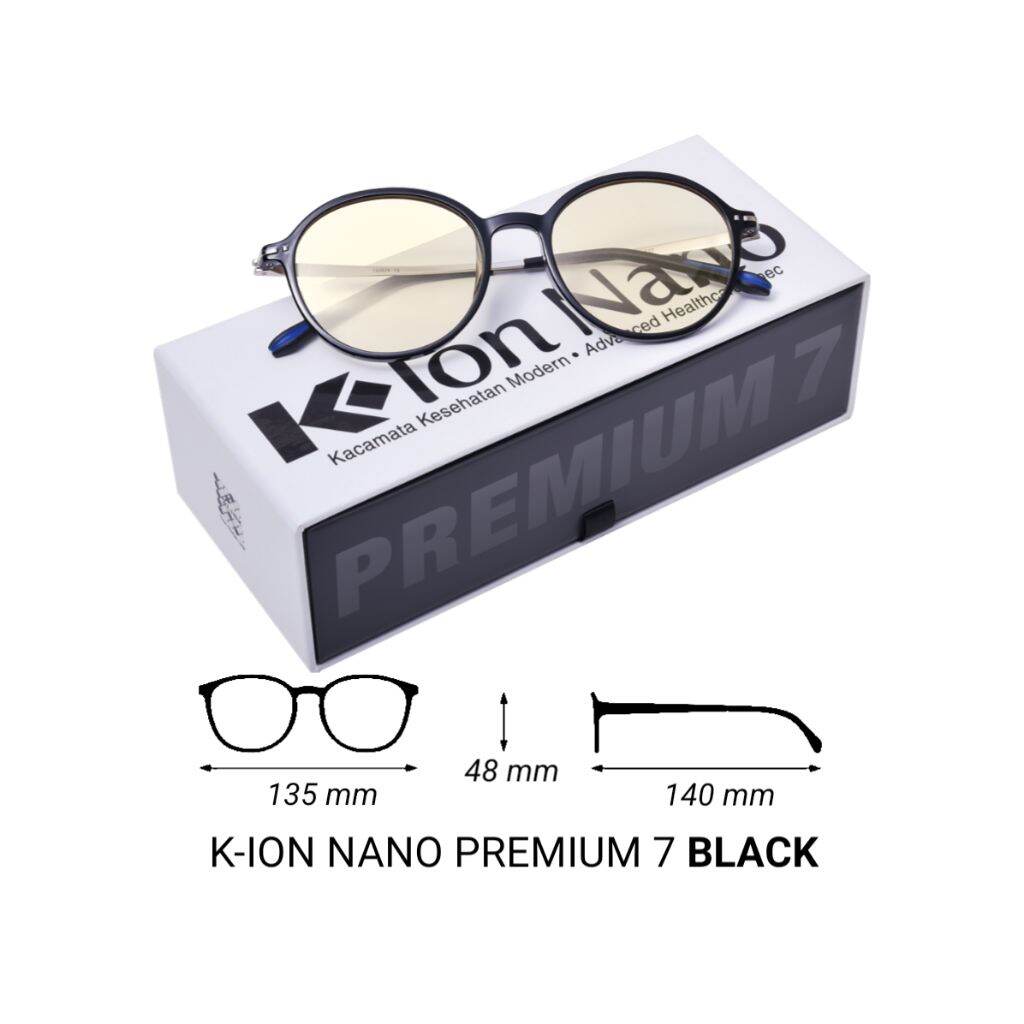 Kacamata Kesehatan Modern + Advanced Healthcare Spec Kacamata K-Ion Nano Premium 7 bergaya vintage dengan desain minimalis. Dengan bentuk round frame (bingkai bulat) yang menambah kesan stylish. Framenya menggunakan material thermoplastic rubber dan titanium yang kuat. Ditambah dengan teknologi ion negatif dan far infrared ray untuk menjaga kesehatan mata. Penambahan pelapis karet (temple tips) pada gagang mengurangi gaya jepitan di telinga, menjadikannya lebih nyaman. Keunggulan Lensa anti sinar blue ray = menyerap dan memantulkan sinar biru yang merusak mata. Berdasarkan uji spektrometer menunjukkan, lensa K-Ion Nano Premium 7 mampu memblokir rata-rata 40 % efek negatif sinar dan pita cahaya biru sehingga lebih efektif melindungi mata. Anti sinar UV = melindungi mata dari efek negatif sinar ultra violet yang berbahaya sehingga dapat memperlambat proses penuaan. Anti Fog (kabut) = melindungi penglihatan saat kabut atau uap, saat lensa terkena kabut atau uap maka akan cepat hilang. Aman dan nyaman di segala kondisi.